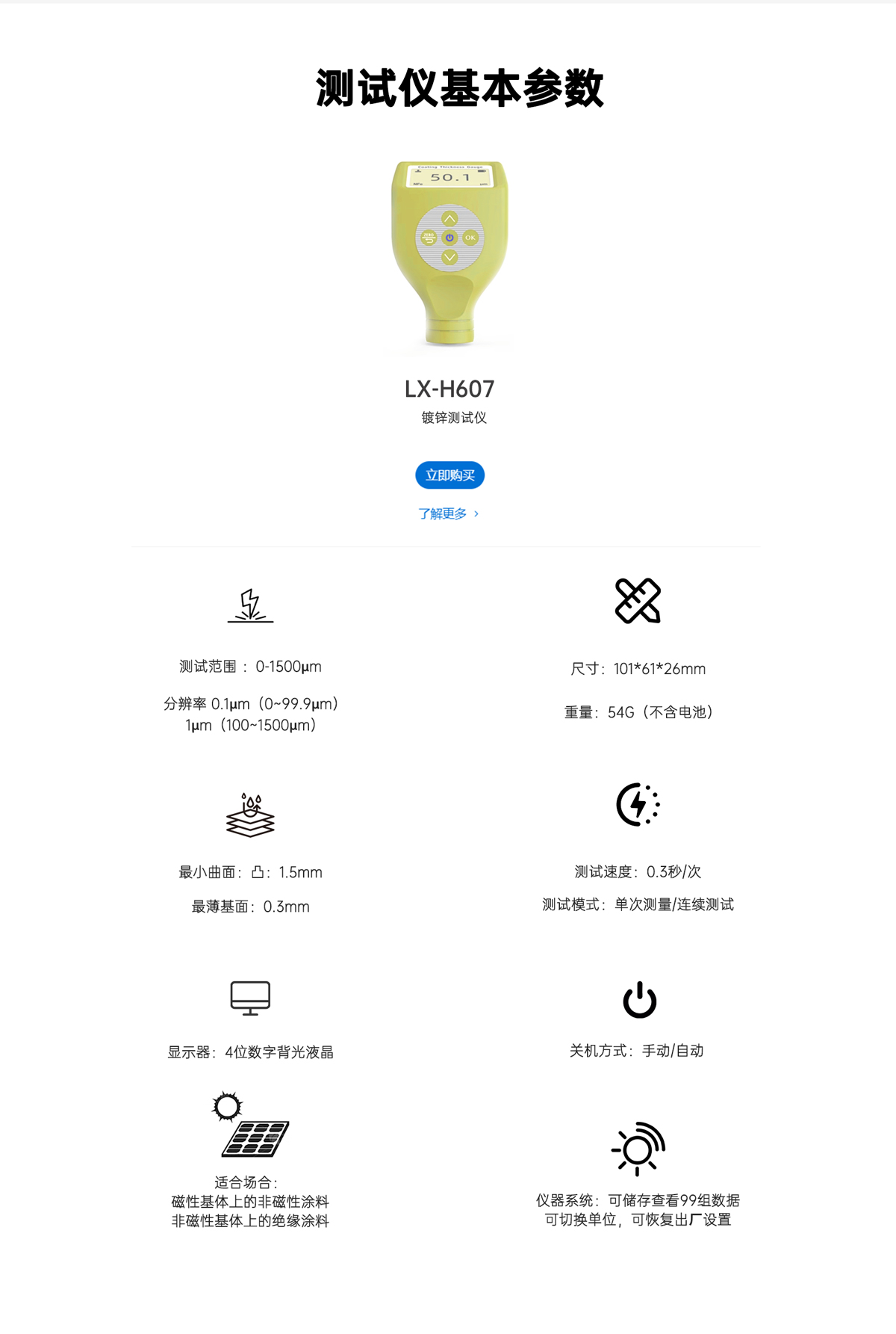 萊科斯LX-H607鍍鋅測量儀具有背光、大屏幕數字顯示、單點和多點校準等功能,并且本產品耐高低溫,抗摔,探頭耐磨(50萬次以上),測試穩定性好,測試速度快,適用于各種測量環境。其技術參數完全符合國家標準和國際標準。