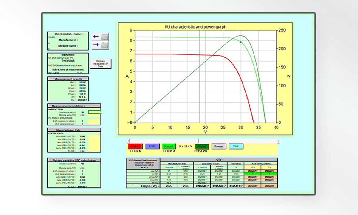 電壓、電流、功率、電性能;開(kāi)路電壓(Ucc)、短路電流(Isc);光伏模塊和陣列的I/V曲線;光照度;模塊溫度