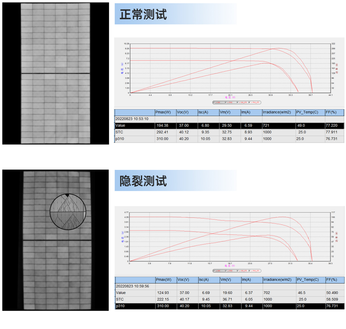 • 光伏電池板破?貫穿整個電池?,但通過伏安特性測試,在如圖分析軟件中看到,開路電壓和短路電流損失分別為10.9%和53.7%,但測試曲線出現(xiàn)出現(xiàn)明顯改變,功率損失分別達(dá)到67.8%和STC-63.5%。便攜式IV測試儀可更好的輔助EL檢測從?判定組件是否可繼續(xù)使?。