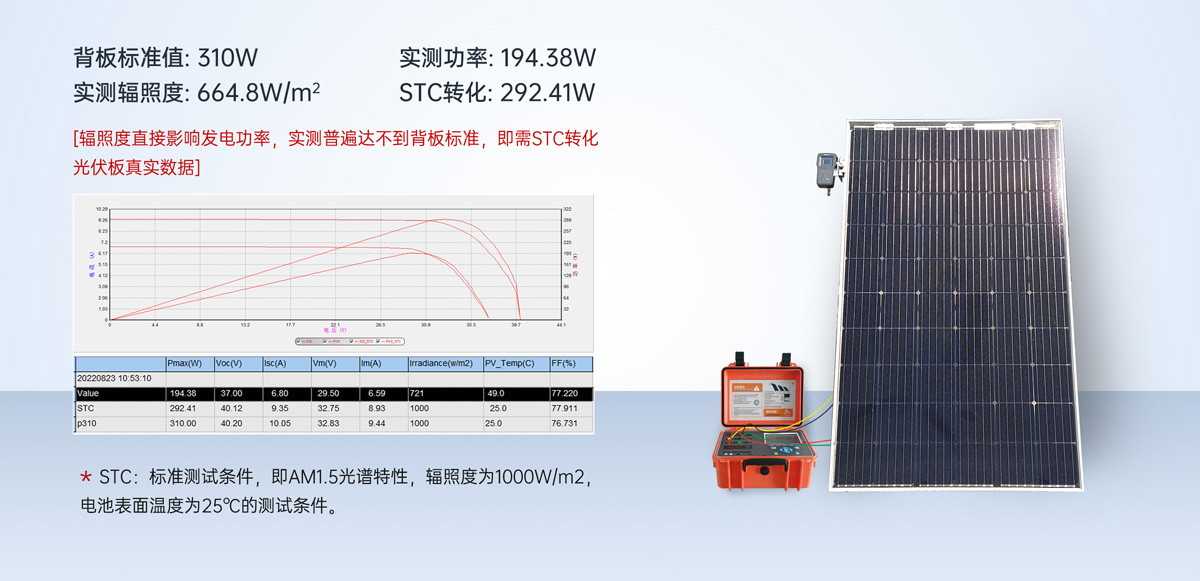 • STC標(biāo)稱參數(shù)轉(zhuǎn)化測試:IV測試,匹配當(dāng)前95%以上光伏電池板規(guī)格,更快速的切換不同規(guī)格組件參數(shù),并?動計算出電池板當(dāng)前發(fā),電效率以及轉(zhuǎn)化率,幫助?戶更精準(zhǔn)的知悉組件真實參數(shù)。